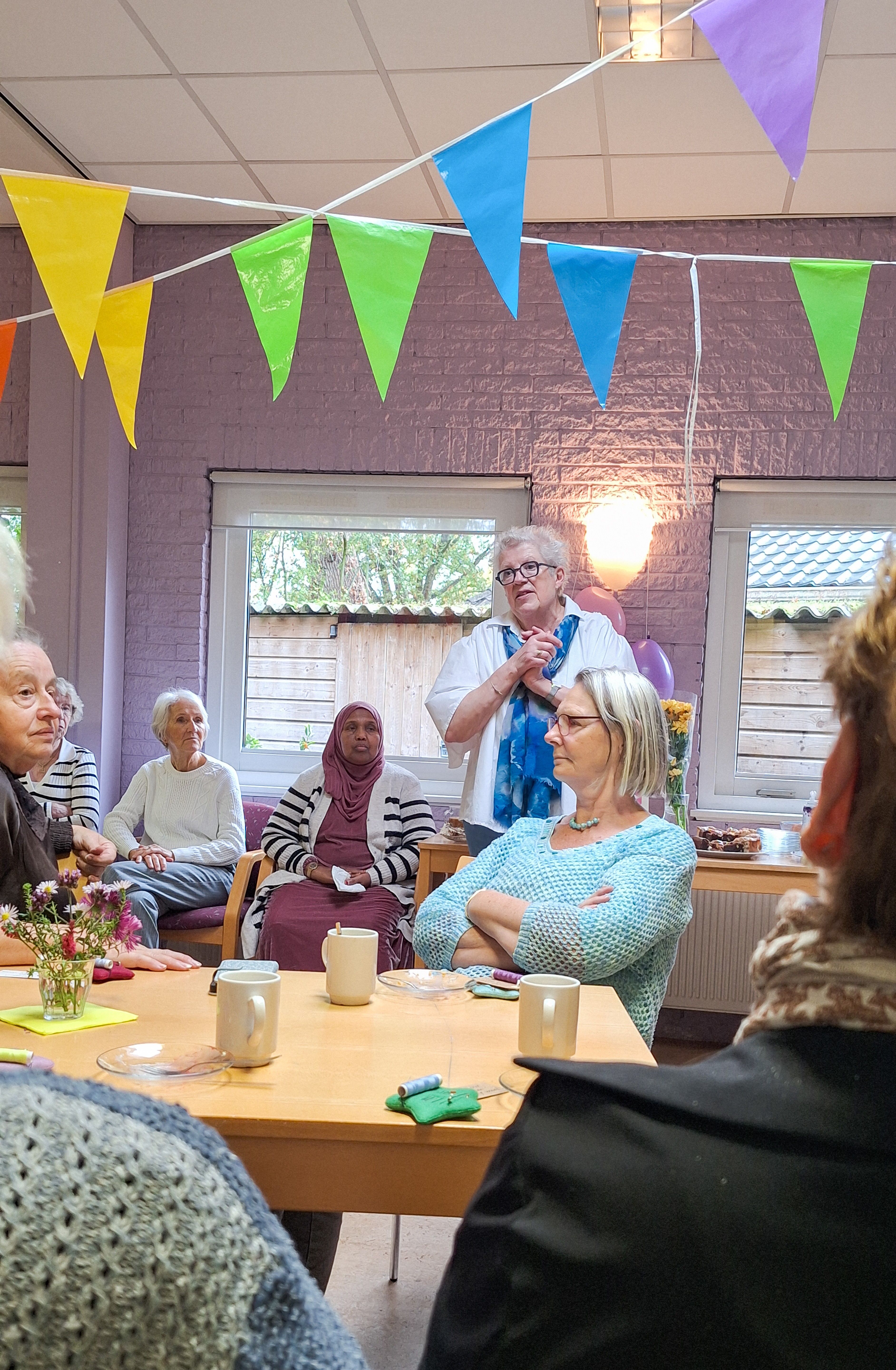 Dit jaar bestaat de Naai- en Ontmoetingsgroep tien jaar en dat mocht gevierd worden! De tafel stond vol met zelfgemaakte hapjes en er werd volop gekletst en gelachen. Coördinator Margreeth van der Brugge sprak de groep toe over de impact van het naaiatelier en zette alle vrijwilligers in het zonnetje.