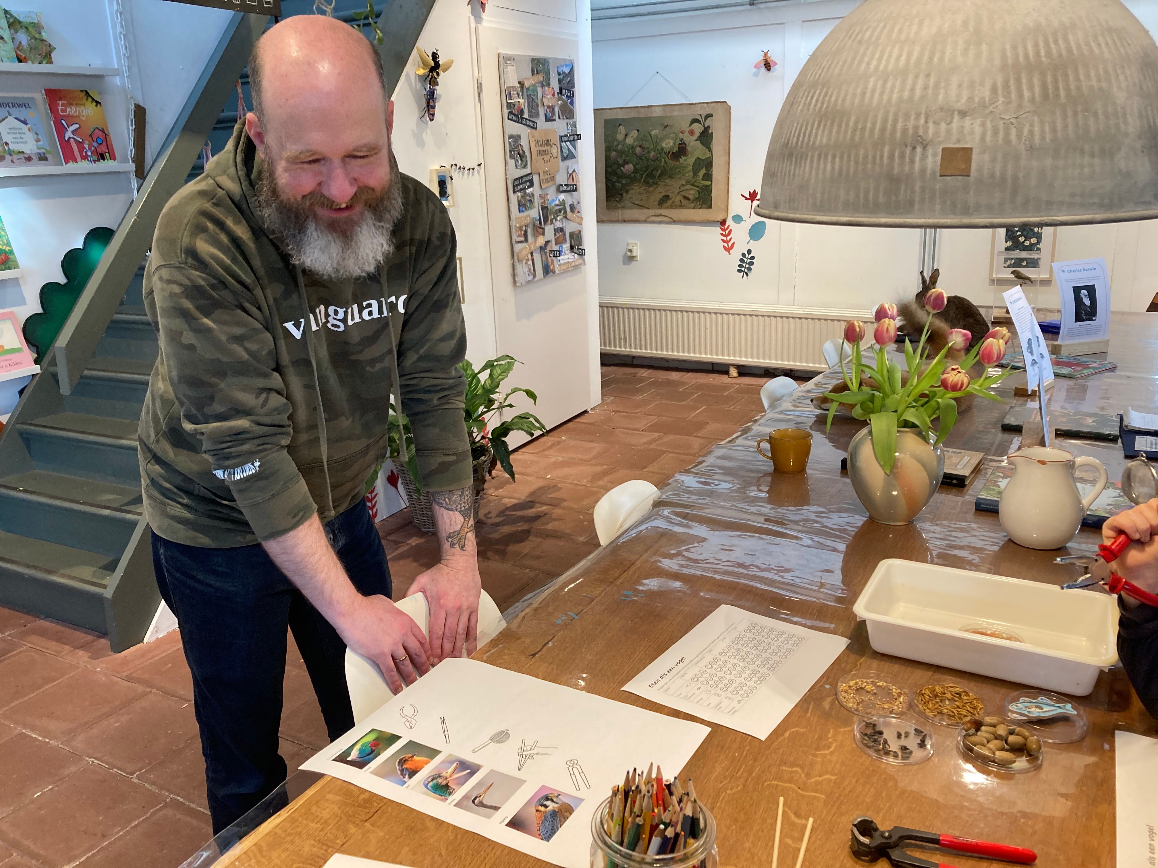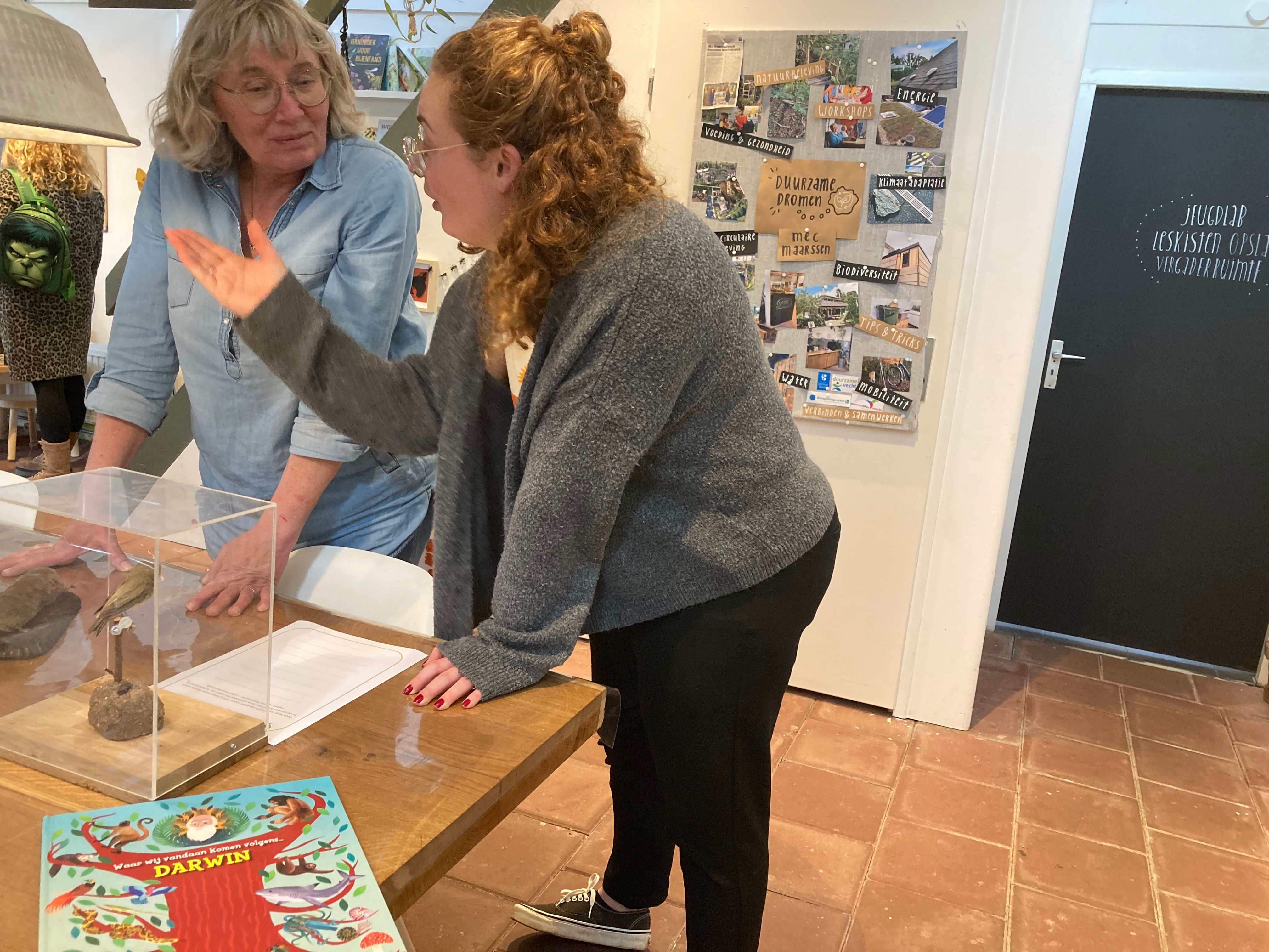 “Vandaag is het voor het eerst Darwindag”, vertelt Lonneke. “Best een ingewikkeld thema, want hoe ga je over evolutie praten met kinderen? Maar Sanne (Hoekman, vaste medewerker, jv) bereidt dat voor.” De eerste kinderen arriveren en Lonneke begint meteen over het thema van de middag: “We gaan het hebben over Charles Darwin, dat is deze meneer (ze wijst op een foto van hem), en die heeft de evolutie ontdekt; dat alle diertjes en plantjes door de jaren heen zijn ontstaan omdat ze zich moesten aanpassen aan waar ze woonden. Dus als een bijtje ergens nieuw kwam en dacht: o, die bloemetjes ken ik niet, dan paste het bijtje zich zo aan dat hij ook van die bloemetjes kon eten en zo konden uiteindelijk heel veel soorten ontstaan. Zo zijn er ook vogeltjes met verschillende snaveltjes omdat ze allemaal wat anders eten.”